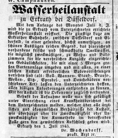 Ohne Zeitangabe ist auch die Übernahme des Besitzes an Herrn Dr. med. Wilhelm Wachendorff aus Erkrath, der wahrscheinlich das Kurhaus erbaut und betrieben hat. Leider lässt es sich nicht genau feststellen wann das Gebäude errichtet wurde. Die Daten im Stadtarchiv sind recht unterschiedlich angegeben, es müsste aber auf jeden Fall zwischen 1833 und 1840 gebaut worden sein.